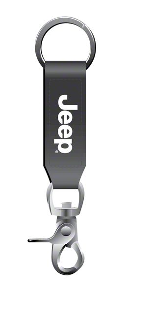 Jeep Strap Key Chain. This awesome black leather "Jeep Strap Key Chain" is perfect for organizing your keys in one place. A convenient lever-back closure at one end allows you to attach it to your belt loop, purse strap, a zipper pull. On the other end is a key-loop that can accommodate any number of keys and of course the best part is that the black strap features the "Jeep" logo in white.