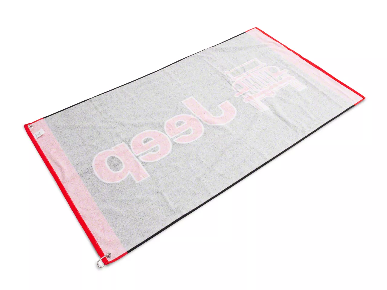 Versatile Uses. This clever Jeep "Towel2Go" is an oversized beach towel that is the coolest towel you'll ever own, because it has a Jeep on it! Plus, it comes with an added benefit. At one end, each corner has a grommet hole and a carabineer clip comes hooked to one of the holes. Use the clip to keep track of your keys when you're at the beach. Or use it to keep the towel in place drying it on a windy day. You can also use it to hold the towel against your seat driving home from a dirty day. It's a simple concept but you'll find lots of uses for the carabineer clip built into this towel.