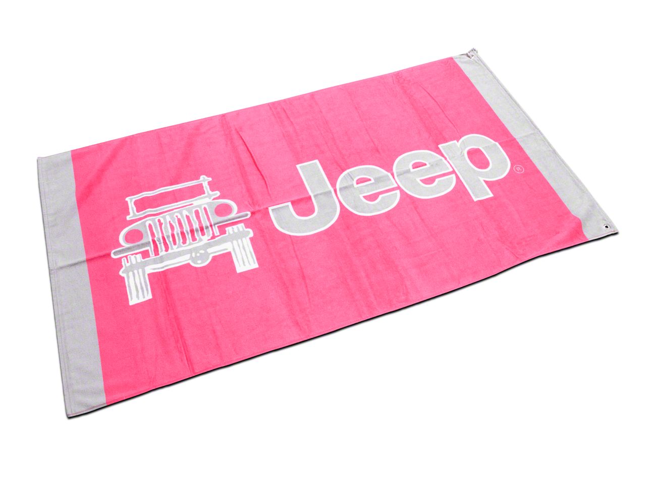 Towel and More. This pink Seat Armour Towel 2 Go is an oversized beach towel that is the coolest towel you'll ever own. It has a Jeep logo and the word "Jeep" on it! Plus, it comes with an added benefit. At 1 end, each corner has a grommet hole and a carabineer clip comes hooked to one of the holes.