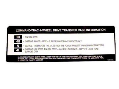 Description. Emblem; This reproduction transfer case sun visor decal from Omix fits 94-98 Jeep Cherokee and 97-98 Wrangler with a Command-Trac NP231 transfer case.