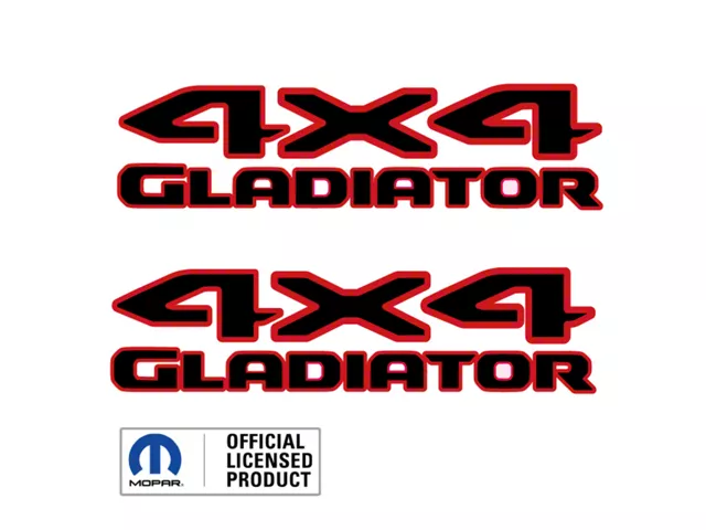 Stylish Tailgate Accent. The 4x4 GLADIATOR Tailgate Logo adds a bold and stylish accent to the rear of your Jeep Gladiator, enhancing its rugged appearance. This logo features a black design with a red outline, making it a striking addition to your vehicle.