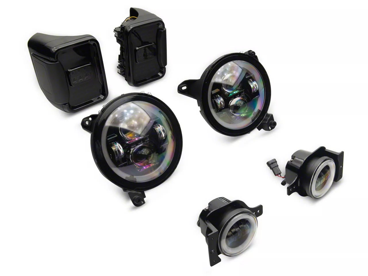 Application. The 9-Inch LED RGB Halo Headlight, LED RGB Fog Light and LED Tail Light Package fits 2020-2026 Jeep Gladiator JT models with Factory Halogen Tail Lights.