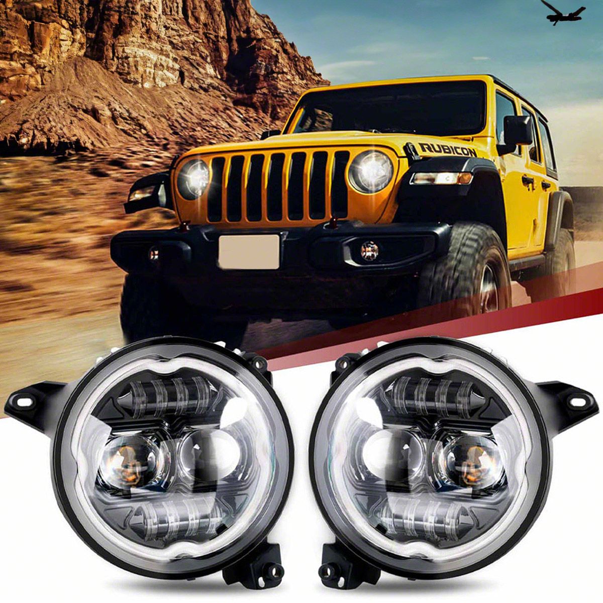 LED Headlights. Upgrade your Jeep Wrangler JL with these advanced LED headlights, which include two 4-inch fog lights for enhanced visibility in all conditions. Featuring a matte black finish housing and clear transparent lens, these headlights provide a sleek and modern look while delivering powerful illumination.