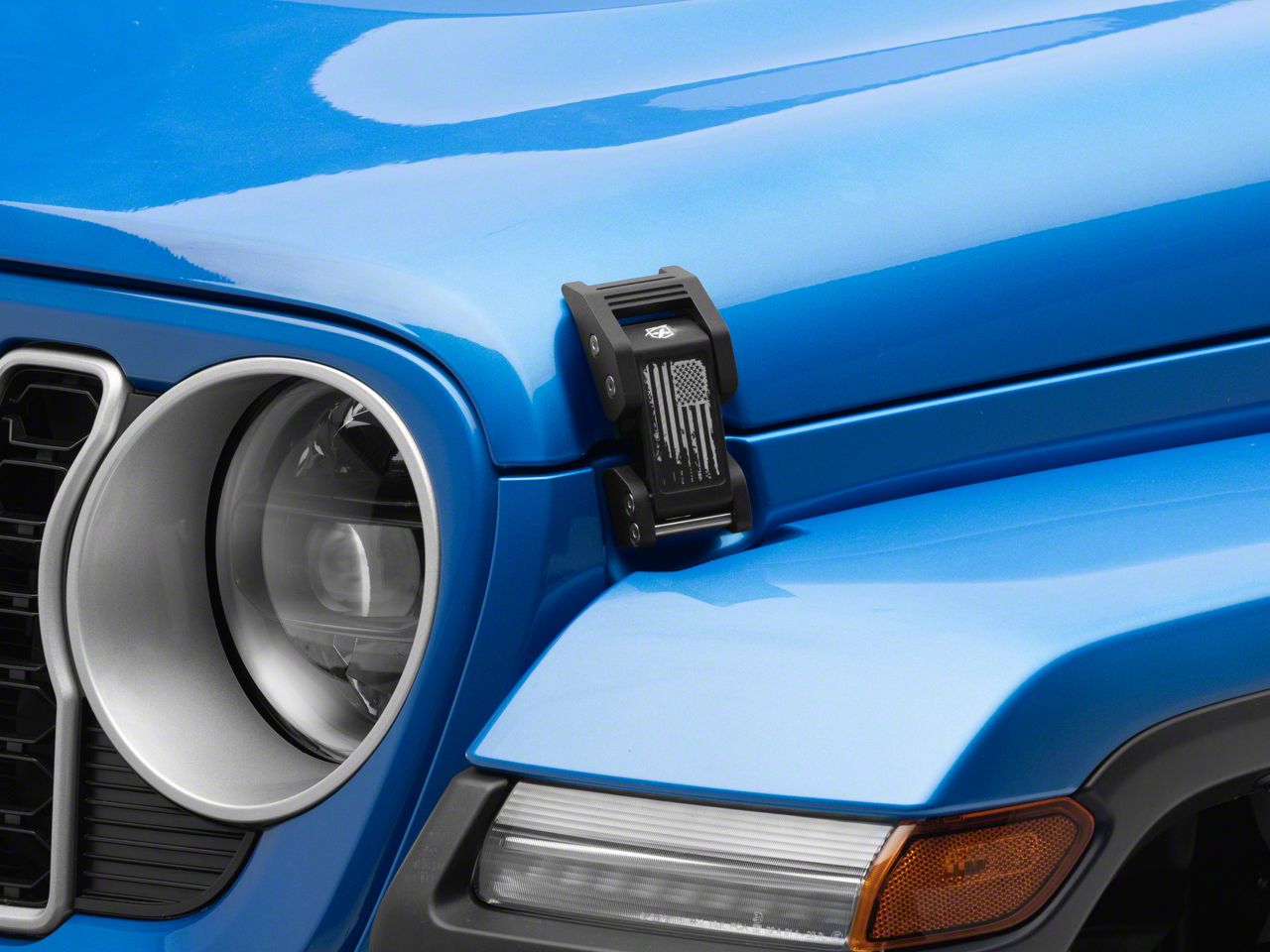 Stylish and Durable Hood Latches. The Aluminum Hood Latches are designed to provide a secure and reliable hold for your vehicle's hood while adding a distinctive touch with a distressed U.S. flag design. These latches are engineered specifically for the Jeep Gladiator JT models, combining functionality with a unique aesthetic to enhance the vehicle's overall look.