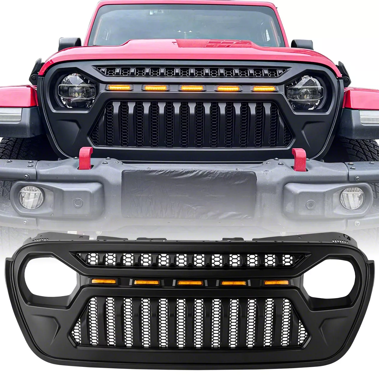 Matte Black Tactical Finish. The Angry Birds Grille with White/Amber LED Lights; Matte Black for 2020-2026 Jeep Gladiator JT features a stealthy matte black coating that resists fading and weather damage. This finish delivers a rugged, tactical look that pairs perfectly with any exterior color scheme.