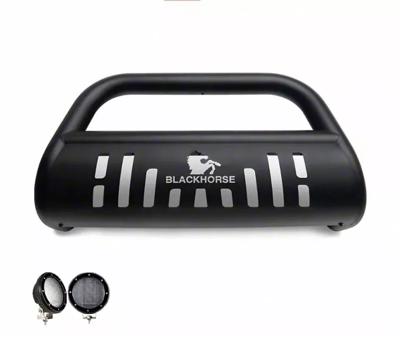 Bull Bar and More. The Bull Bar with 5.30-Inch Black Round Flood LED Lights in Black is the perfect solution for those looking to add an extra layer of protection to their vehicle while also boosting its style. This kit includes a set of 5.3-inch Black Round Flood LED lights for a well-lighted nighttime adventure. The skid plate protects the undercarriage components of your vehicle, while the round LED lights are added illumination, especially during off-road driving.