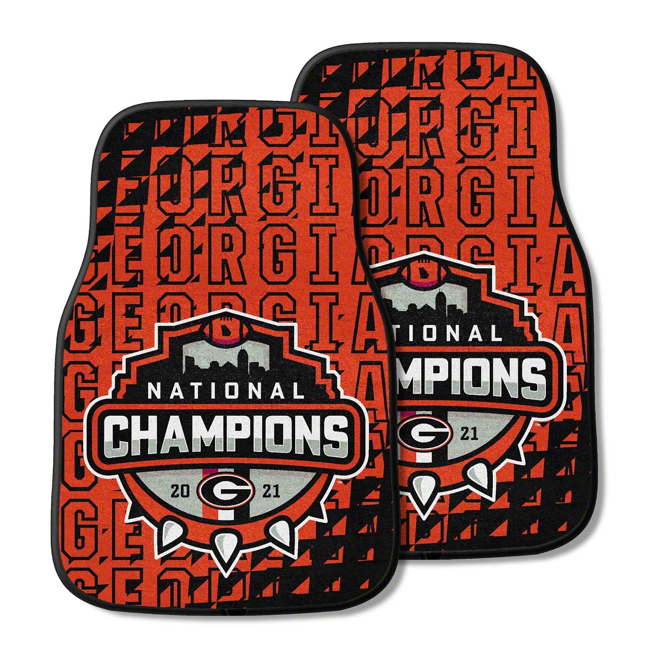 Application. These Carpet Front Floor Mats with University of Georgia 2022-23 National Champions Logo offer universal fitment for most vehicles, with possible adaptations for a custom fit.