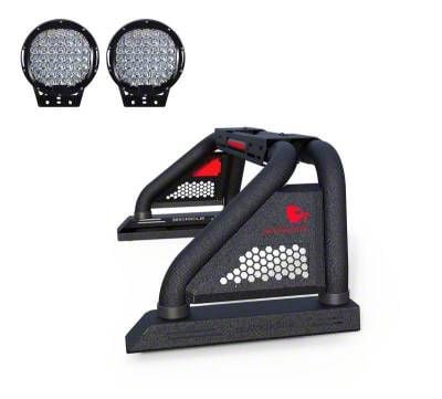 Robust Bed Support. Elevate the functionality and style of your Jeep Gladiator JT with the Classic Pro Roll Bar with 9-Inch Black Round Flood LED Lights; Black. The standout feature of this roll bar is the pair of 9-inch black round flood LED lights. These powerful lights enhance your night visibility, making off-road adventures safer and more enjoyable. The flood beam pattern ensures a wide area of illumination, perfect for lighting up dark trails or campsite setups.