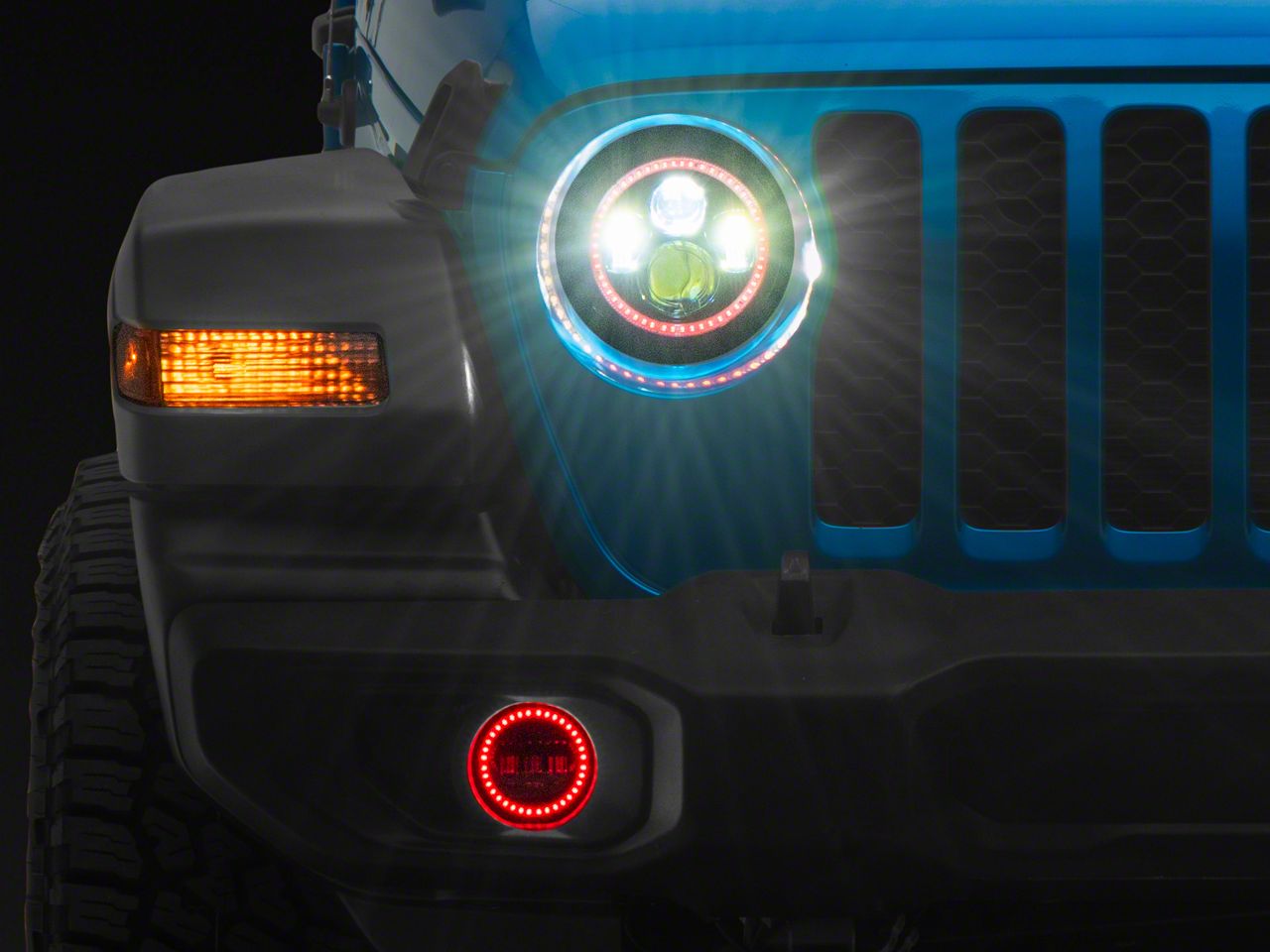 Description. This amazing New Jeep All-In-One Solution Headlight and Fog light Kits is the perfect way to upgrade your frontal lights on your 2018+ Jeep Wrangler JL or Gladiator. For the headlight, we use our revolutionary 7-inch LED Sealed beam RGB Halo ring headlight and fit it into an adapter ring to perfectly fit into the 2018+ 9-inch hole with a flush look. For the fog light, we again use our revolutionary 4” RGB Halo ring lights but have made a perfect fitment adapter for them to fit into the Jeep fog light holes seamlessly. This kit does it all for you. Everything you need is in one box for the installation.