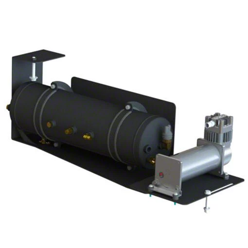 Consistent Airflow. With a 23.0 compressor amps rating and a 150 psi maximum pressure capacity, this Direct Fit Onboard Air System ensures reliable performance and consistent airflow. The 100% duty cycle at 100 psi further guarantees that the air compressor can operate continuously at maximum capacity without overheating. Moreover, it boasts a 2.8-gallon air tank coated in resilient black paint, providing ample volume for various air-powered applications.