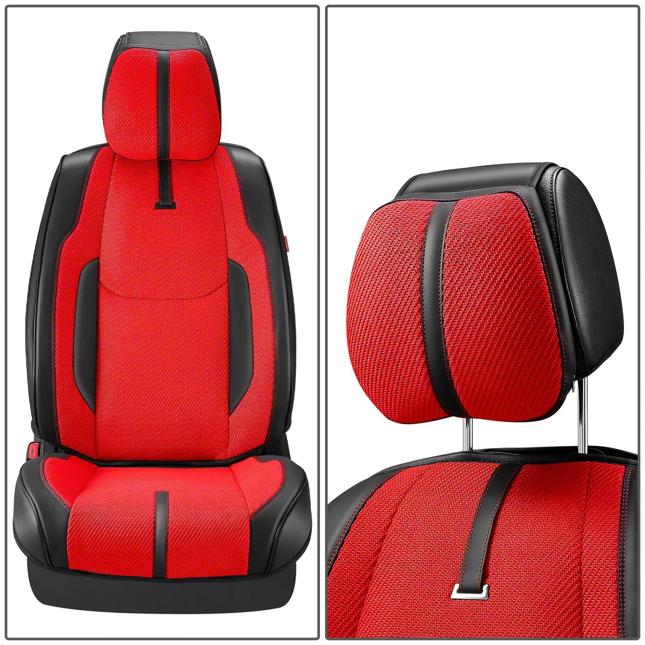 Protective Seat Upgrade. The Drive Series Front Seat Covers provide a stylish and durable solution for preserving your vehicle's factory seats. Designed with a universal fit, these covers protect against daily wear and tear while adding a sporty red and black two-tone look to your interior.