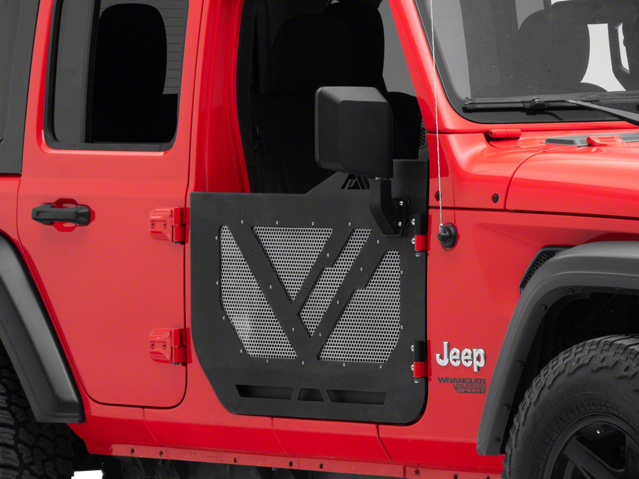Heavy-Duty Doors. These half front doors are made of CNC laser-cut steel frame with removable aluminum mesh panel inserts. These inserts are paintable or powder-coated to match the color of your vehicle. Stainless steel hardware, a rattle-free and flexible latch mechanism, and rubber bump stops are included for a hassle-free installation.