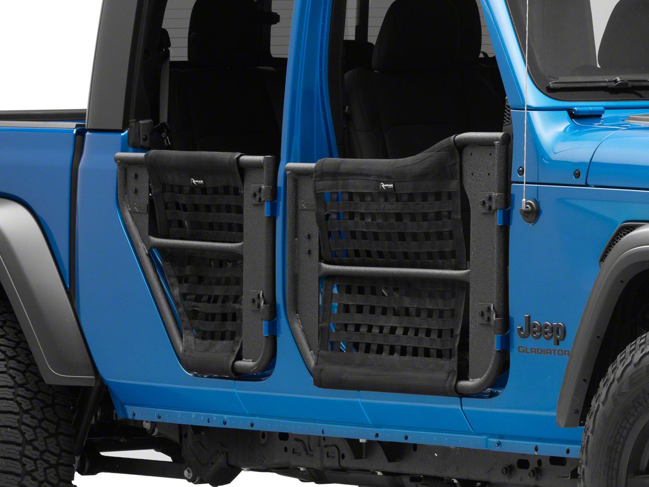 Safari-Style Trail Doors. Fully immerse yourself in nature while driving your Gladiator JT with these Front and Rear Trail Doors; Textured Black. Designed for utility and convenience, they feature easy-to-open handles and removable heavy-duty nylon webbing to keep you and your belongings secured in the car, while also letting you experience the natural atmosphere of the off-road.