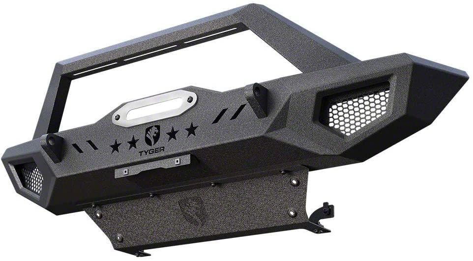 Off-Road Utility. Get more use out of your Jeep and drive more effectively with this Tyger Auto Fury Front Bumper with Skid Plate and Winch Mount; Textured Black. Sporting a tough design, it features multiple mounting points for securing extra lights as well as mounts for a medium duty winch, perfect for off-road recovery.