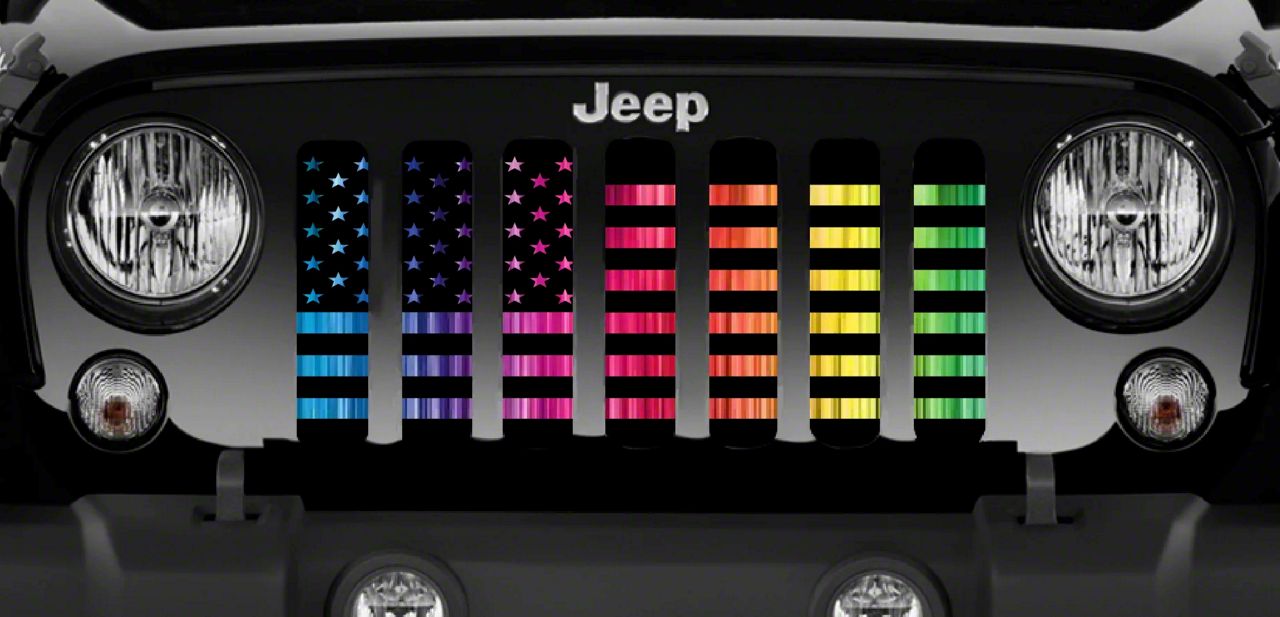 Stylish and Functional Grille Insert. The Grille Insert featuring an American flag with a colorful rainbow design adds a unique and stylish touch to your 2020-2023 Jeep Gladiator JT models. This grille insert not only enhances the aesthetic appeal of your vehicle but also provides practical protection against mud, rocks, and other road debris that could potentially damage your radiator. Its vibrant design ensures your Jeep stands out on the road.