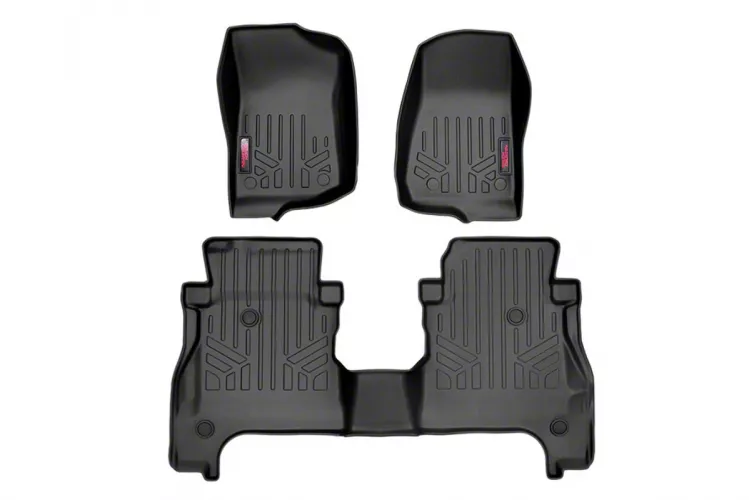 Mess and Stain Protection. Make cleaning your Jeep Gladiator a breeze with these Rough Country Heavy Duty Front and Rear Floor Mats; Black covering your car's interior. Made from thick Polyethylene and sporting high raised edges, it will catch any spill, mud, or any mess from ruining your interior. Simply wash and brush and your floor will look clean and new again.