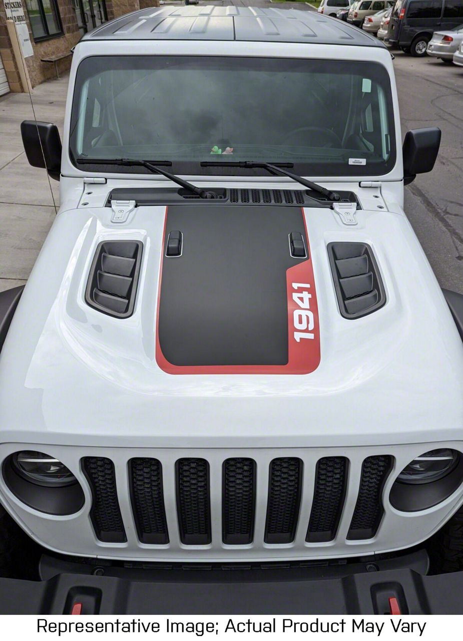 Application. This Hood Stripe with 1941 Logo (Matte Black with Matte Black Pinstripe) fits all 2020-2026 Jeep Gladiator JT (Excluding Launch Edition, Mojave, and Rubicon).