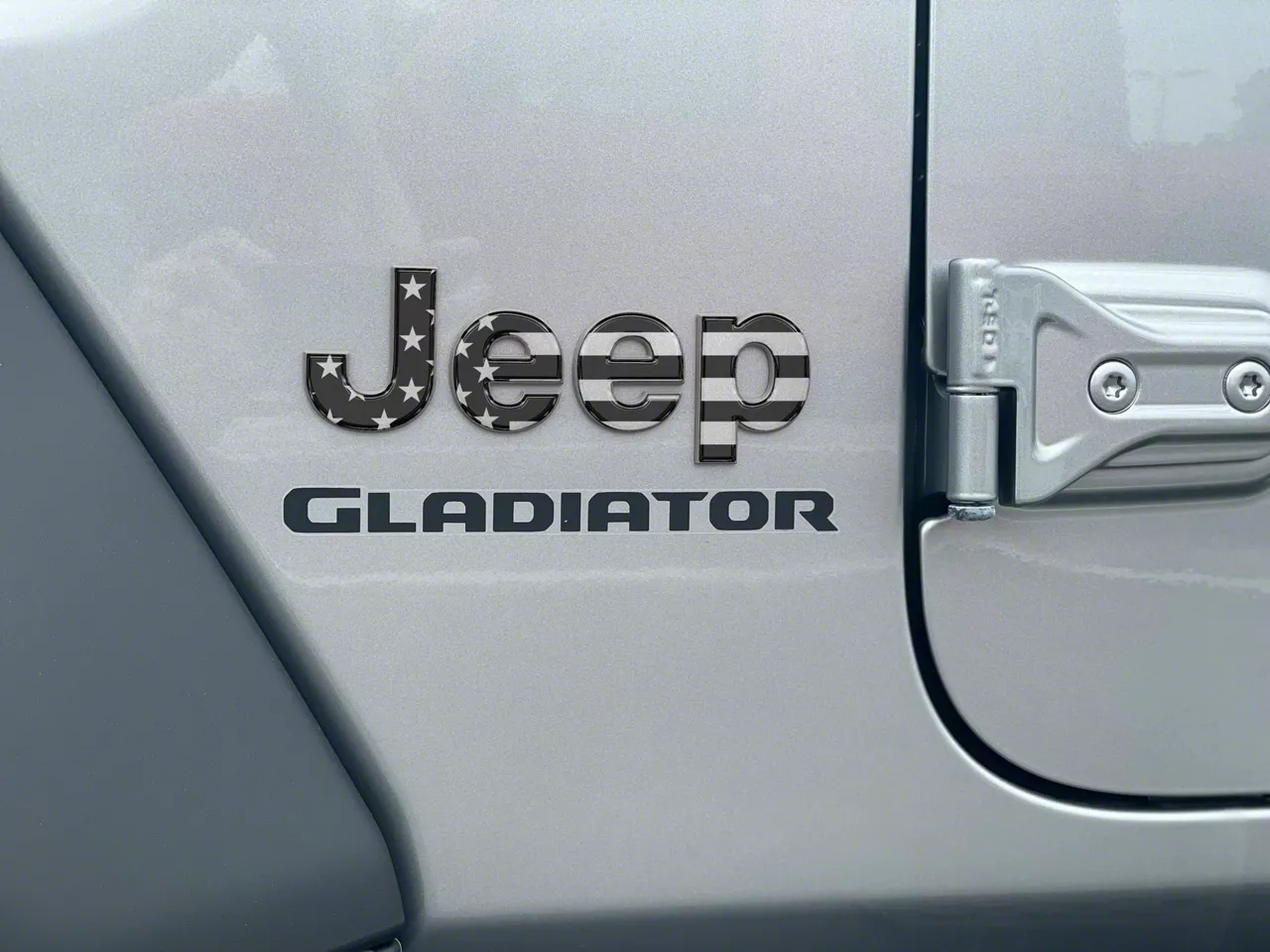 Patriotic Jeep Overlay. Add some personality to your Jeep Gladiator with this Jeep Fender Emblem Letter Overlays; Black and Silver American Flag. Sporting bright modest black and silver accents, it incorporates the American flag into the logo of renowned car manufacturer, Jeep, showing your love for car and country.