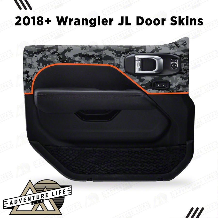 Stylish Interior Protection Upgrade. The Matte Camo Interior Door Skins bring bold customization to the rear interior doors of your 2020 to 2026 Jeep Gladiator JT. Featuring a matte black digital camo finish with vibrant orange outlines, these door skins elevate your interior style while protecting the door panels from scuffs, scratches, and wear. They're ideal for Jeep owners looking to add a unique and rugged touch to their cabin.