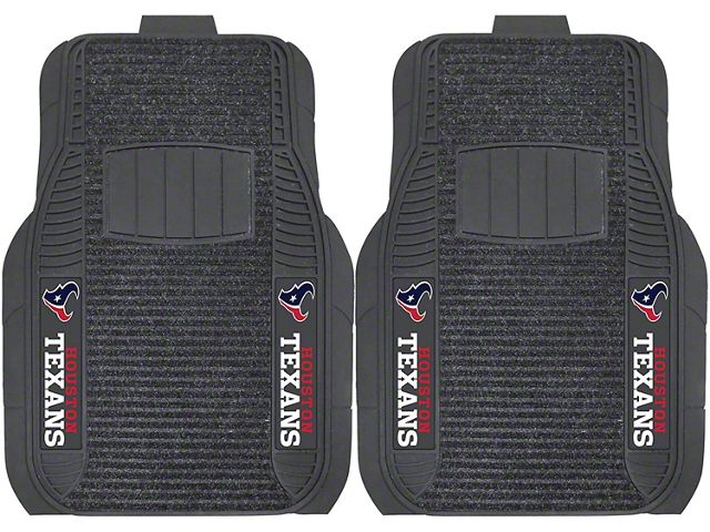 Application. These Molded Front Floor Mats with officially-licensed Houston Texans logo feature a universal design so they will fit most makes and models of vehicles. These Mats can be trimmed to fit if necessary. Sold as a set of two Mats.