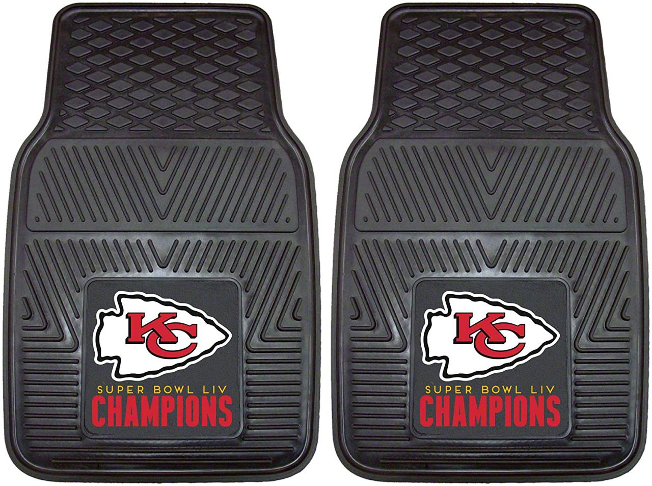 Application. These Molded Front Floor Mats with officially-licensed Kansas City Chiefs logo feature a universal design so they will fit most makes and models of vehicles. These Mats can be trimmed to fit if necessary. Sold as a set of two Mats.