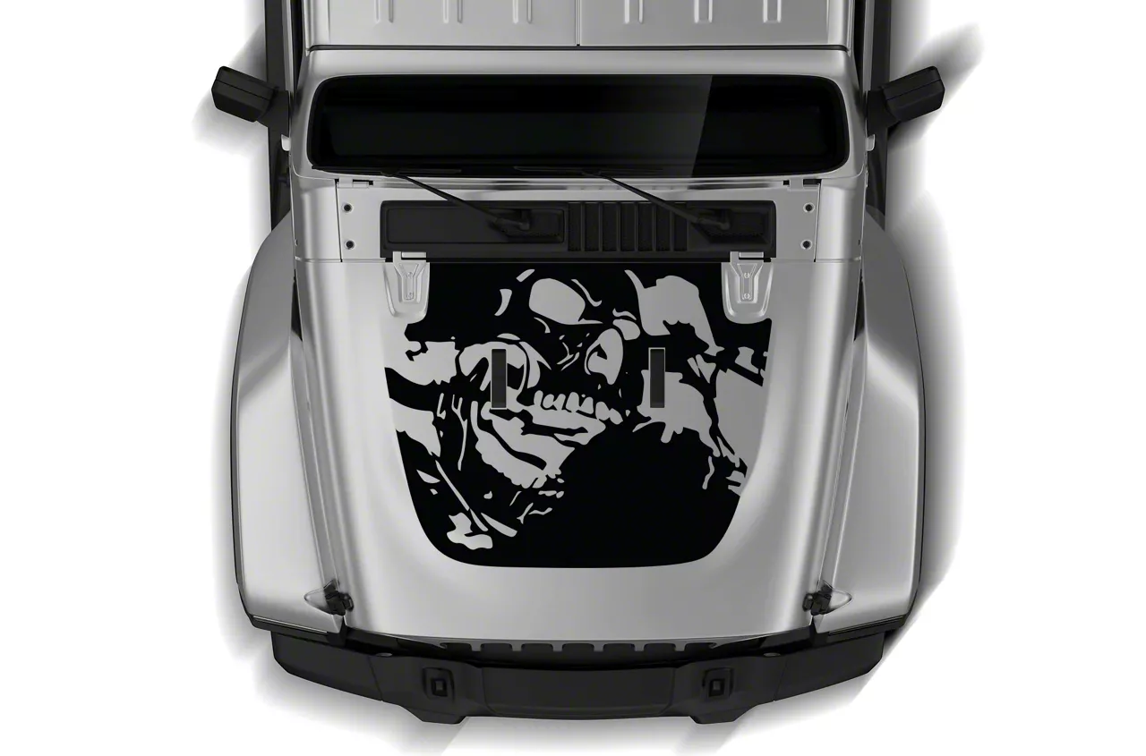Style & Durability. The matte black color adds a menacing and stylish edge to your vehicle, making it stand out from the crowd. Additionally, the graphic is treated with UV protection to resist fading and damage from the sun's harsh rays, ensuring it maintains its bold look for years to come. Easy to apply and designed to complement your Gladiator's rugged aesthetics, this hood graphic is the perfect upgrade for Jeep owners looking to add a touch of personalization and aggressive flair to their vehicle.