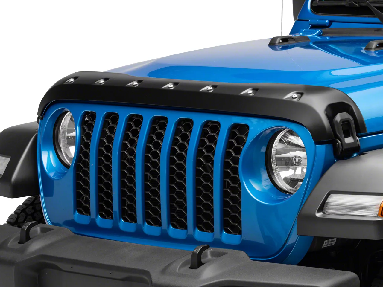 Extra Front End Protection. Protect the leading edge of your JT Gladiator's hood from stones, rocks, and other debris by installing a Premium Bolt-On Look Hood Deflector. A hood deflector sometimes called a Bug Guard will give you all of the benefits of a traditional automotive bra without the hassles.
