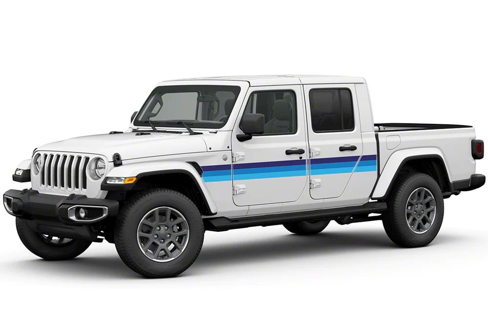 Retro Style. Made for the Jeep Gladiator JT, these Side Stripes come in pairs with a tri-color blue stripe design. Built in a cool retro style, these side stripes add a unique decal to your ride and makes it stand out among other Gladiators.