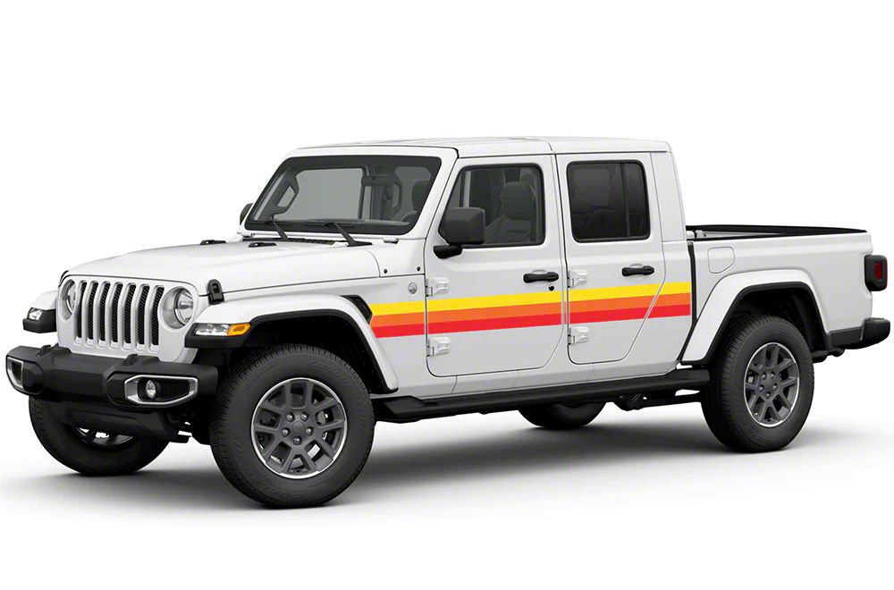 Application. The Retro Side Stripes; Yellow/Orange/Red fits 2020-2026 Jeep Gladiator JT models.