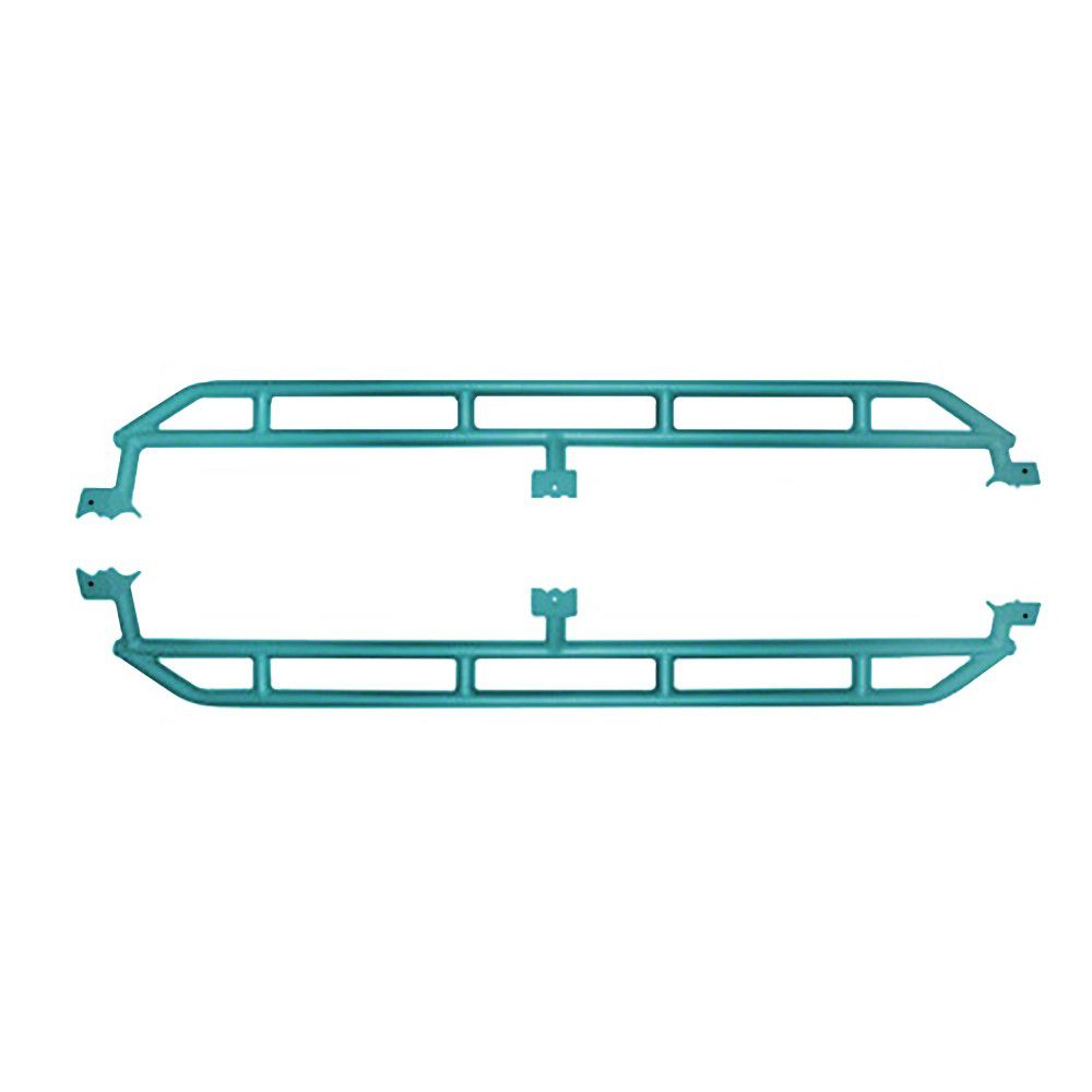 Teal Triumph. These Rock Sliders aren't just about function; they're a bold statement of individuality and style. The unique teal color, coupled with the robust design, sets your Jeep apart from the crowd, transforming it into a head-turning off-road machine. This distinctive aesthetic appeal goes beyond mere visual enhancement; it reflects your personal taste and passion for adventure.
