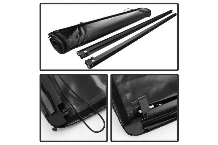 Soft Roll Up Style. This assembly utilizes a soft roll-up style with a durable tarp that will quickly roll up into a compact bundle right behind your rear window. This design enables you to completely expose your bed for maximum function. This tonneau cover features a pair of elastic bands situated at the section closest to the cab, enabling you to drive with the cover rolled up. Meanwhile, its mounting tracks come with hook and loop strips that run the length of your cover, keeping the tarp secured. What’s more, this cover is equipped with quick-release latches that keep the cover secured and inaccessible with the tailgate raised and locked.