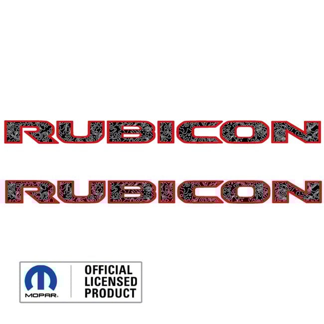 Officially Licensed Mopar Product. Made for the Jeep Gladiator JT models, these Rubicon Logo Hood Decals are an officially licensed Mopar product that comes in pairs. These hood decals have a topographical design in a matte black finish with gray lines and a red outline.