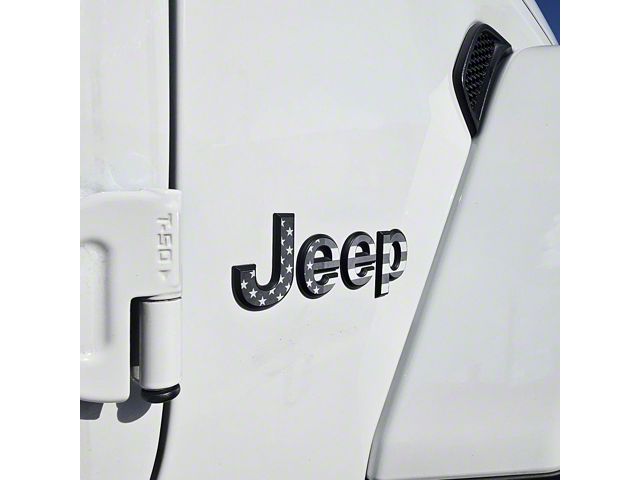 Patriotic Fender Overlays. The Side Fender American Flag Vinyl Overlays provide a bold and stylish way to show your patriotism while customizing your Jeep Wrangler JL. The black and white flag design enhances the vehicle's appearance with a unique and eye-catching accent.