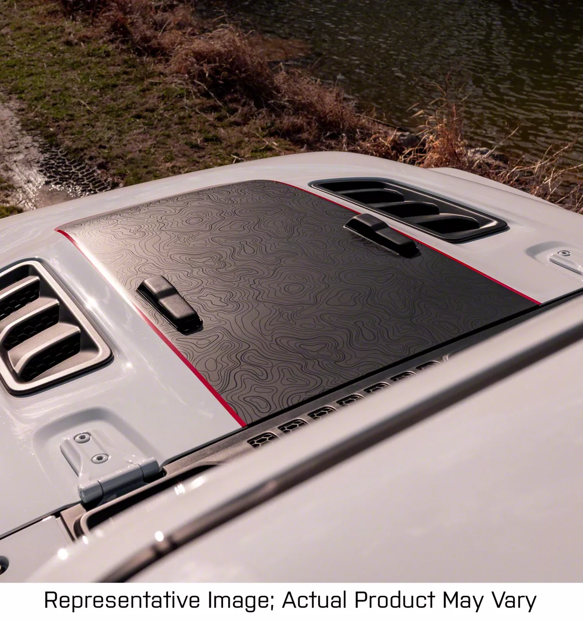 Stylish and Unique Hood Graphic. Enhance the look of your Jeep Gladiator JT Rubicon with this stylish hood graphic featuring a topographic map design. The matte black finish with a glossy black outline adds a distinctive and rugged touch to your vehicle.