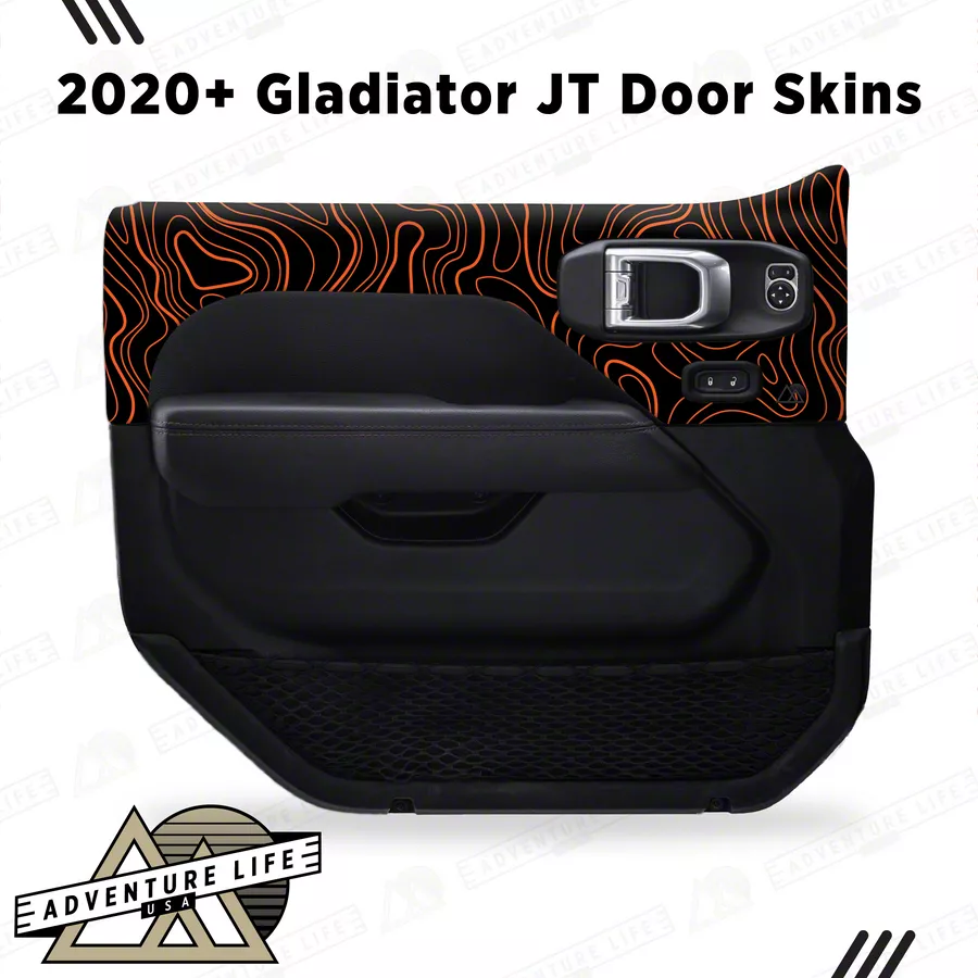 Distinctive Interior Upgrade. The Topographic Map Interior Door Skins are designed to enhance the style and protection of your vehicle’s interior doors. Made specifically for front applications, these skins deliver a customized, trail-ready look while offering functional defense against daily damage. With their unique topographic design and vibrant gloss orange accents, they elevate the cabin's visual appeal and add a bold touch of individuality.