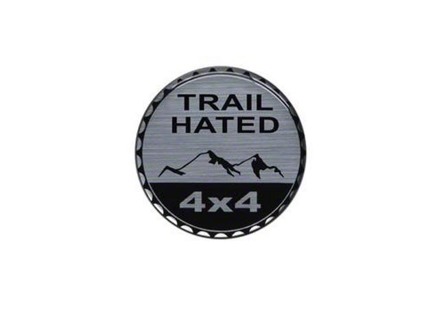 Appearance. This circular badge features "TRAIL HATED" in black with a mountain range underneath. That section has a silver backing, while "4x4" is in silver below the mountains with a black backing.