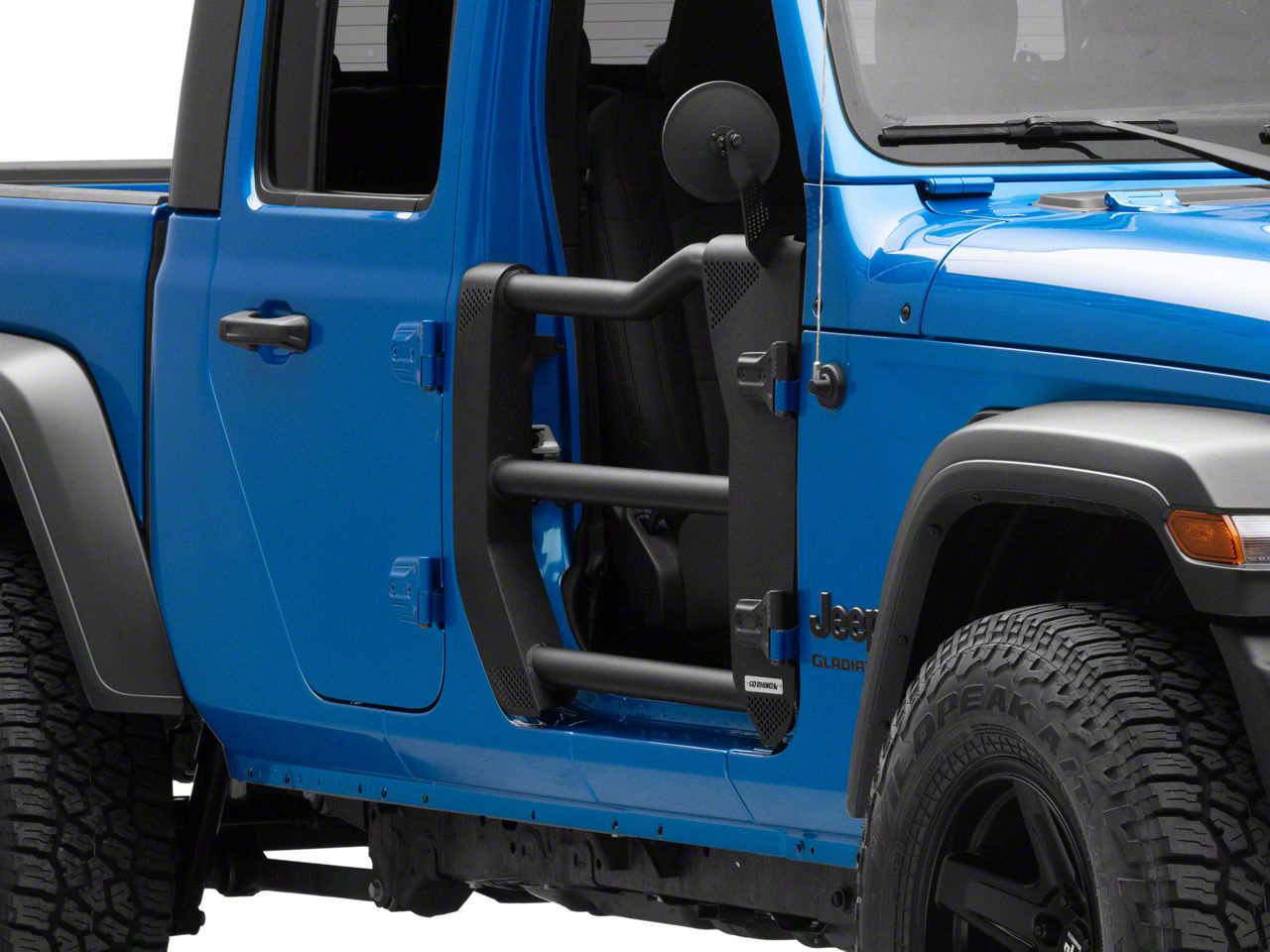 Secure, Open-Air Experience. Take your Jeep Gladiator to the trails with reinforced outdoor confidence by replacing your factory doors with these Trailline Textured Black Front Tube Doors. The semi-open structure provides more visibility of the rugged terrain for added ride excitement and more skillful navigation. Furthermore, the doors are equipped with anti-vibration rubber handles, multi-position limit straps, and 6-inch mirrors for reinforced safety.
