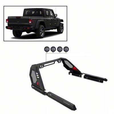 Enhanced Cargo Utility. Take your Jeep Gladiator's nighttime off-road adventure to the next level with the Vigor Roll Bar with 5.30-Inch Black Round Flood LED Lights; Black. It blends robustness, functionality, and fierce style to give you the ultimate 4x4 experience. The bar's integrated 5.30-Inch LED Lights pierce through the darkness with exceptional brightness. These efficient LEDs deliver high illumination levels, consuming low power for an ideal balance of brightness and longevity.