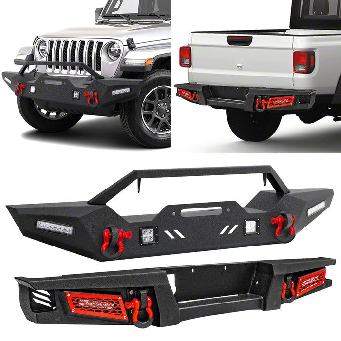 Full-Protection Off-Road Bumper Kit. The Winch Mount Front and Rear Bumper Combo Kit with LED Lights is the ultimate armor and lighting upgrade for 2020 to 2026 Jeep Gladiator JT owners. Designed for serious off-road performance, this combo includes rugged front and rear bumpers, winch compatibility, powerful integrated LED lights, and heavy-duty D-ring shackles. It delivers an aggressive look, enhanced functionality, and trail-ready strength in one comprehensive package.