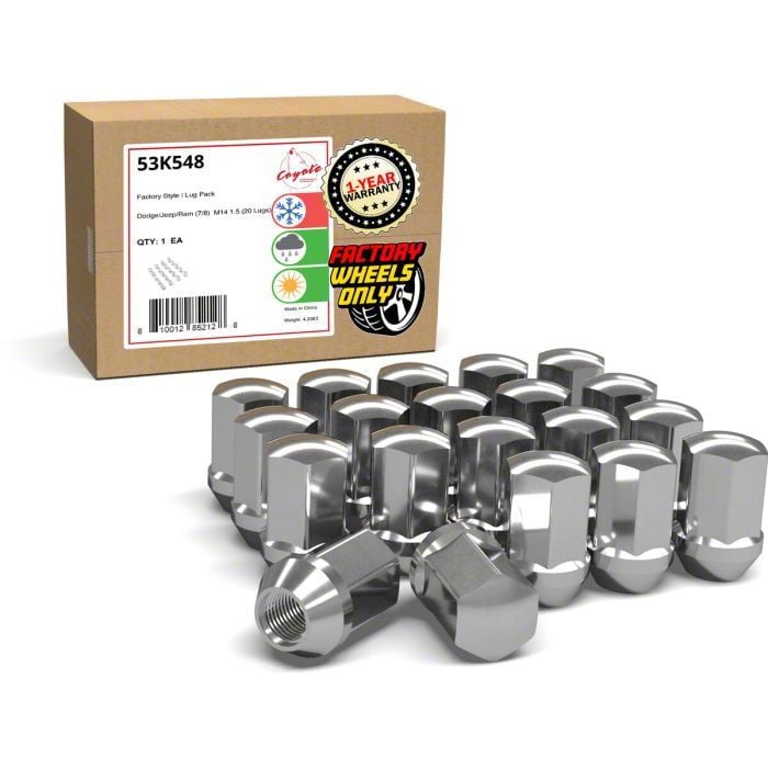 Secure and Stylish. The Chrome Factory Style Lug Nut Kit is meticulously engineered to offer a secure and stylish solution for wheel installation. This kit includes 20 OEM-style lug nuts, featuring a shank conical seat design that ensures a snug and safe fit, while the chrome finish adds a touch of elegance to your vehicle's wheels.