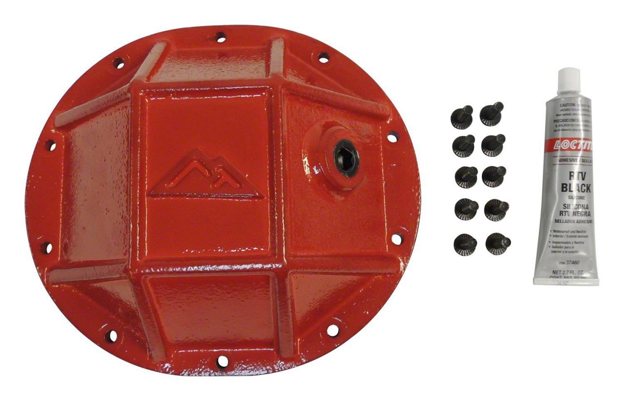 Cooler Operation Under Pressure. Featuring a distinctive red finish and a design that may incorporate fins (depending on the specific model), the Chrysler 8.25 Rear Axle Heavy Duty Differential Cover is engineered to facilitate more effective heat dissipation compared to the original factory cover.