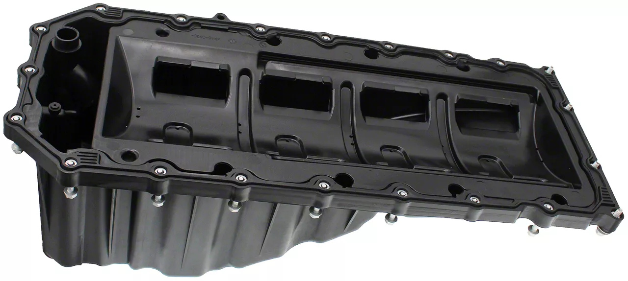 Construction and Appearance. Manufactured using high-quality plastic materials, this oil pan is built for durability and strength. It features a high-strength coating to prevent corrosion, ensuring long-lasting use. The black finish enhances its appearance while maintaining a factory-like look.
