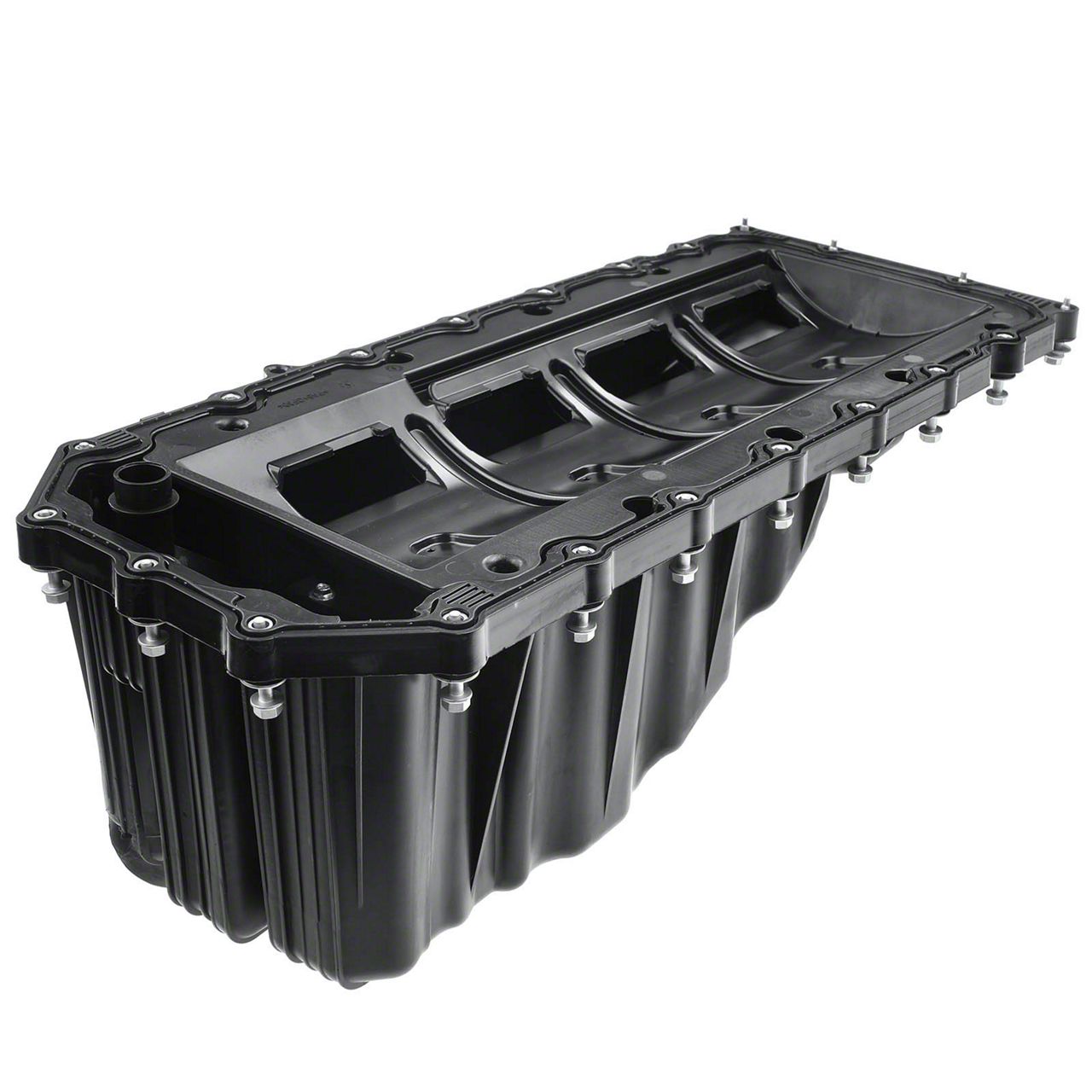 Construction and Appearance. This oil pan is crafted from durable plastic material, providing a lightweight yet sturdy structure. It features a black finish that offers corrosion resistance and a clean, professional appearance, suitable for demanding engine environments.