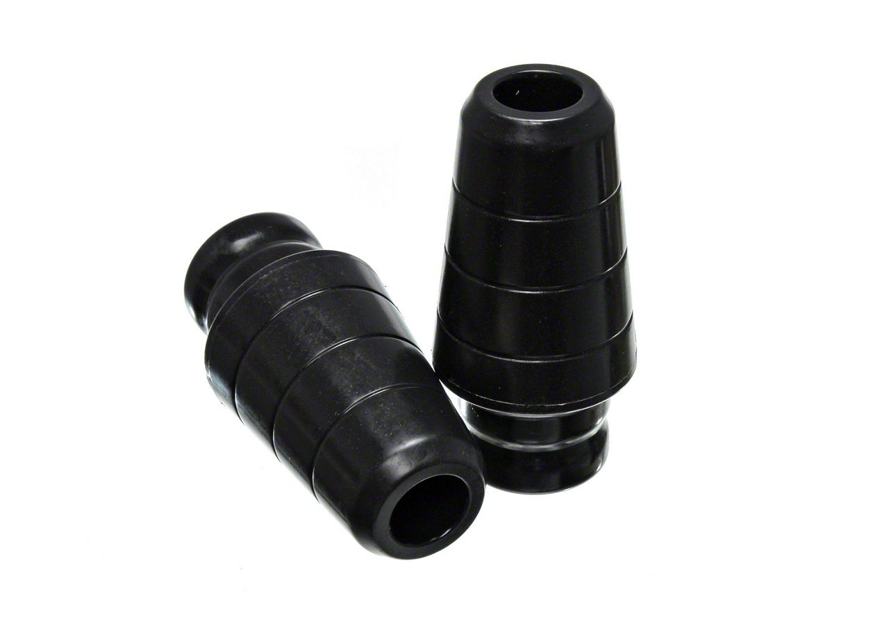 Construction and Appearance. Featuring a rugged matte black finish, these bump stops are crafted from advanced Hyper-Flex material, known for its high resilience and durability under extreme loads. This material offers long-lasting elasticity and structural integrity, ensuring these bump stops continue to absorb impact and protect your suspension for miles to come.