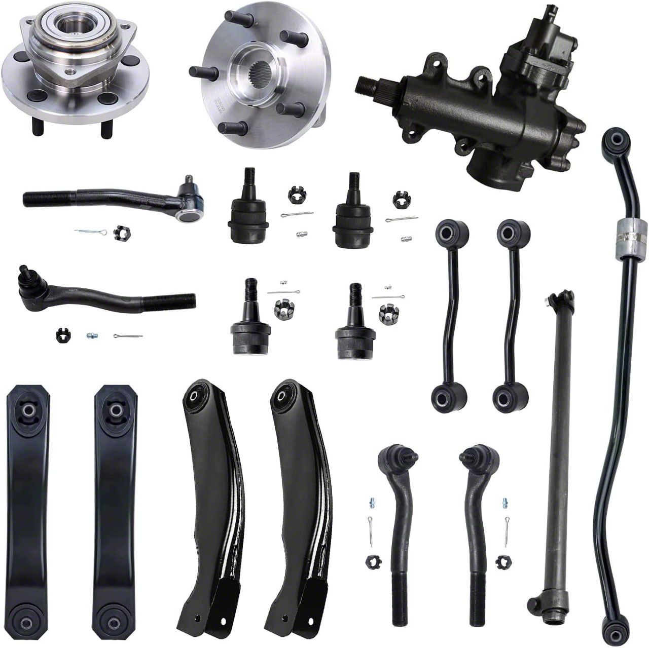 Complete Front Suspension and Steering Upgrade. This comprehensive kit includes Front Wheel Hub Assemblies, Control Arms, a Steering Gear Box, Sway Bar Links, Tie Rods, and a Track Bar, providing an all-in-one solution to overhaul and enhance your Jeep Grand Cherokee WJ's suspension and steering performance. It improves handling, alignment, and stability, ensuring a safer and more controlled driving experience.