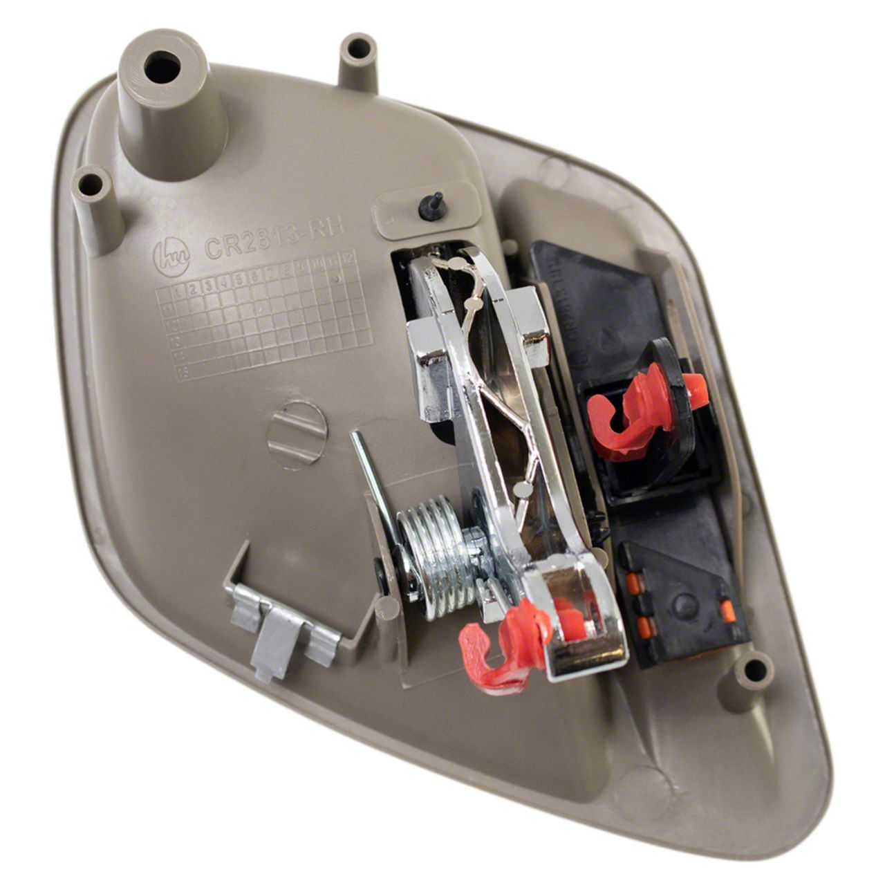 Front Passenger Side Interior Door Handle. The Interior Door Handle; Front or Rear Passenger Side; Pebble Beige and Black is designed to provide reliable operation of the door latch for smooth and effortless entry and exit from the vehicle. It is an essential component that ensures driver and passenger convenience, safety, and comfort. This replacement handle restores original functionality and appearance to the door interior.