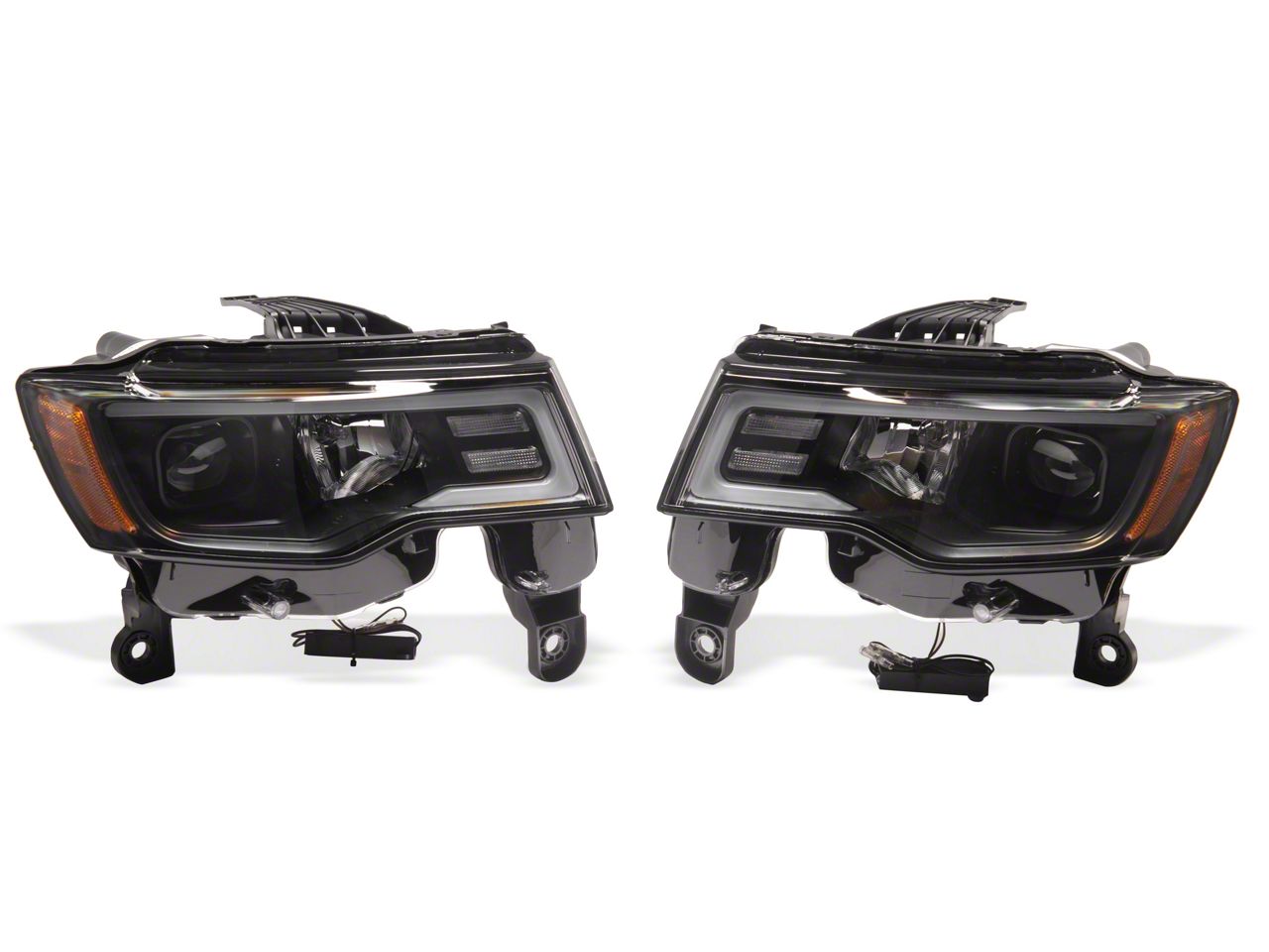 Application. These Plank Style Switchback Projector Headlights; Black Housing; Clear Lens fit 2017-2021 Jeep Grand Cherokee WK2 models equipped with Factory Halogen Headlights.