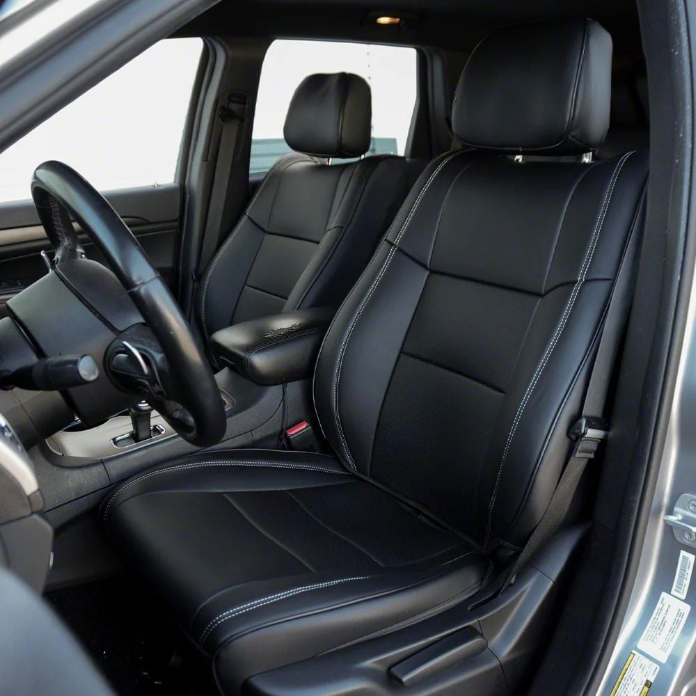 Luxury Seat Covers. The Kustom Interior Premium Artificial Leather Front and Rear Seat Covers in all black with white stitching provide a sleek upgrade for your Jeep’s interior. These covers protect the original upholstery, enhance comfort with their soft surface, and maintain the functionality of seat heaters and ventilated seats, elevating both style and practicality.
