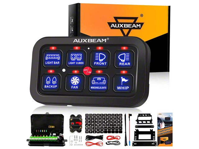 Top-Notch Functional Design. The RA80 Series RGB 8-Gang Multifunction Switch Panel is a versatile and convenient solution for controlling up to 8 different LED lights or devices in your vehicle. With its capacitive sensing technology and blue indicator light display, it provides responsive and intuitive control. The switch panel is designed with automatic dimmable backlight brightness, allowing you to adjust the visibility according to your preference. Its waterproof construction ensures durability and protection against the elements. Additionally, the switch panel can be customized using the provided switch labels, allowing you to easily identify and organize the controls for your specific needs.