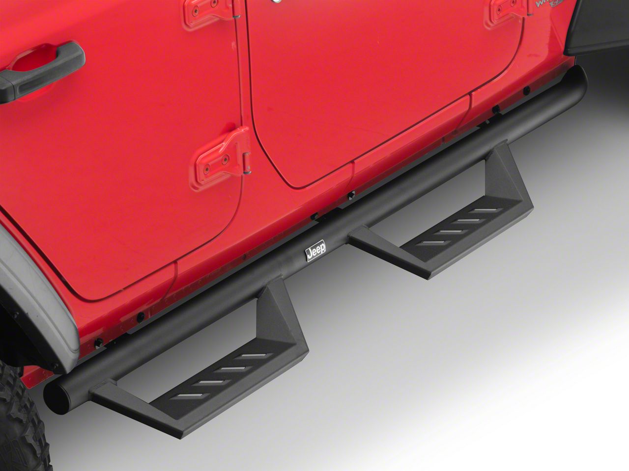 Style and Function. Make getting in and out of your 4-door JL Wrangler much easier by installing a set of Jeep Licensed by RedRock Tubular Drop Side Step Bars. With an angular drop stepped design, these black textured Side Steps not only provide easy entry into your lifted Jeep, but they also give your Wrangler a rugged off-road appearance. As an added bonus, these Drop Steps provide additional protection from both road and trail hazards.